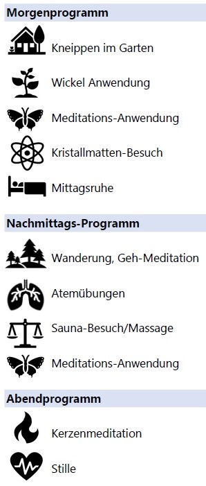 6 Übernachtungen, vitalstoffreiche Vollwertkost oder Fastenbegleitung, Kneippanwendungen, Massagen, Wickel, Sauna, Meditationen, leichte Wanderungen, Joga und Sportangebote, Vorträge, Gespräche; inkl. Tee, Säfte, Gemüsebrühe u.v.m.